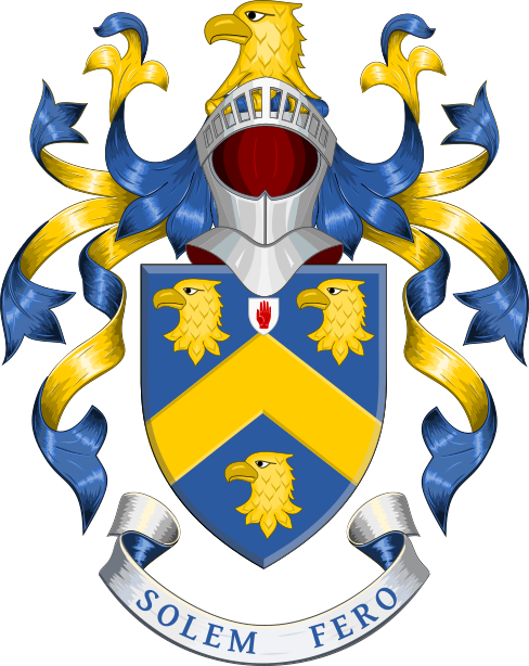 Shield: Azure a chevron between three eagles' heads erased Or. The shield is also charged with a baronet's escutcheon.