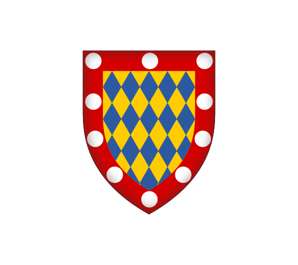 BlazonShield: Lozengy Or and Azure, a bordure Gules semé of plates. |