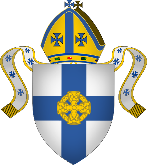 BlazonShield: Argent on a cross Azure a celtic cross Or. |