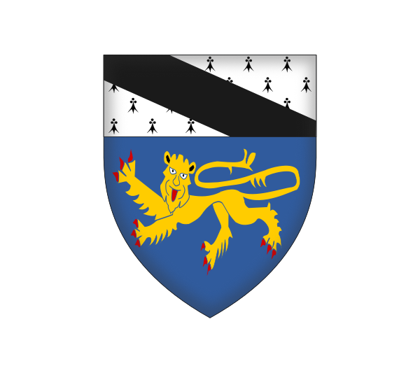 BlazonShield: Azure, a lion passant guardant Or, on a chief Ermine a bend Sable. |
