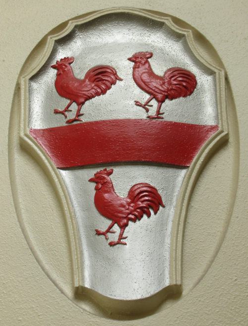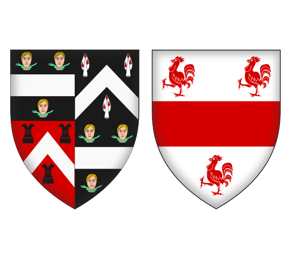 BlazonShield 1: 1 & 4, Sable a fess Argent between three boys' heads couped at the neck, a snake about each one's neck. 2, Sable, a chevron between three spear-heads Argent embrued Gules. 3, Gules, a chevron Argent between three chess-rooks Sable.. Shield 2: Argent, a fess between three cocks Gules. |
