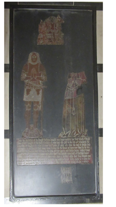 Johnys's monumental brass in St.Mary's Church, damaged during the Blitz in 1941. |