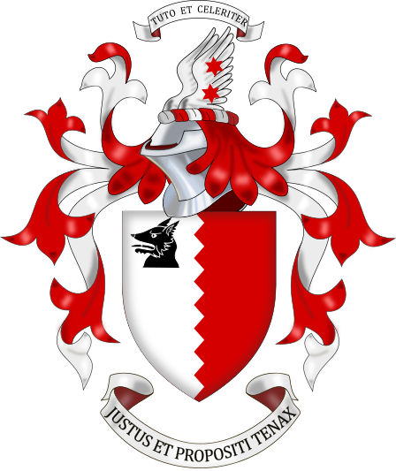 BlazonShield: Per pale indented Argent and Gules, in the canton a wolf's head couped at the neck Sable. Crest: Two wings elevated Argent, charged with two mullets of six Gules. Mottos: Below the shield: Justus et propositi tenax. Over the crest: Tuto et celeriter |
