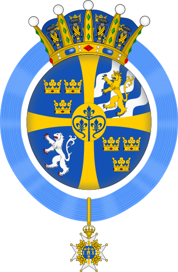 On the shield sits the coronet of Swedish princes and princesses, and surrounding it is the sash (with badge below) of the Royal Order of the Seraphim, Sweden's highest order of chivalry.