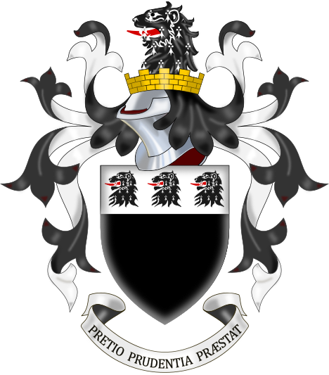 BlazonShield: Sable, on a chief Argent three lions' heads erased Ermines langued Gules. Crest: On a mural crown Or a lion's head erased Ermines langued Gules Motto: Pretio prudentia præstat (Prudence excels reward) |