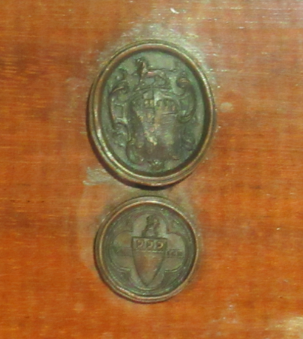 The arms of John Crow Richardson (below) and George Grant Francis (above) on the Swansea Charter Chest. |