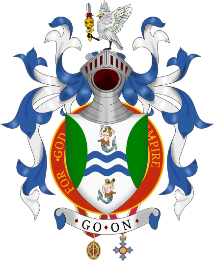 Secombe was made a Commander of the Order of the British Empire (CBE) in 1963, and a knight bachelor in 1981. The arms shown here include a knight's helmet and Knight Bachelor's badge, and the circlet and badge of the Order of the British Empire. The version of his arms shown on the College of Arms website (about half way down the page) does not include a helm or the knight's badge.
