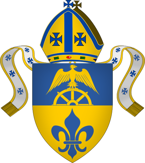 BlazonShield: Per fess Azure and Or, in chief surmounting a Catherine Wheel issuant an eagle rising reguardant of the second, and in base a fleur-de-lys of the first. |