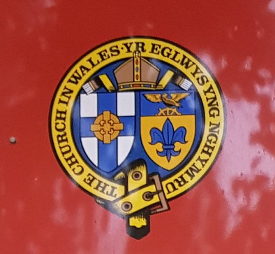 The diocesan arms, alongside the arms of the Church in Wales, appear on Anglican church signs. |