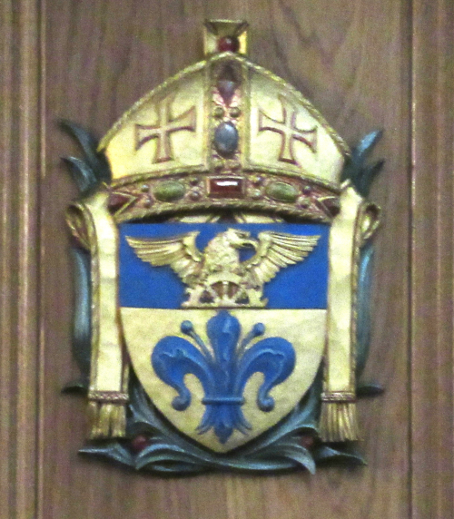 The diocesan arms on the bishop's throne(?) in St.Mary's Church, Swansea. |