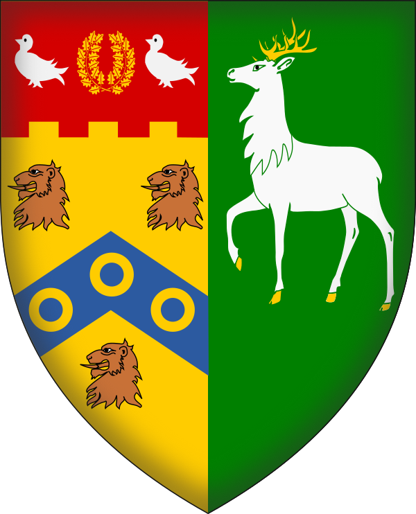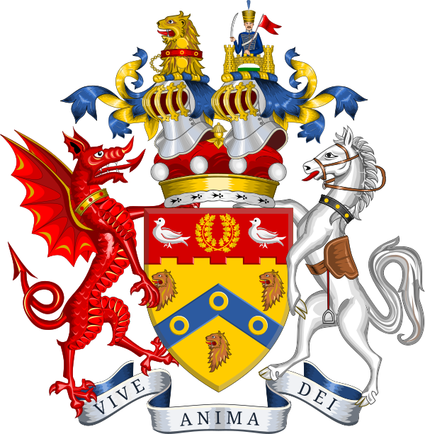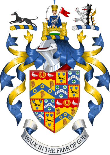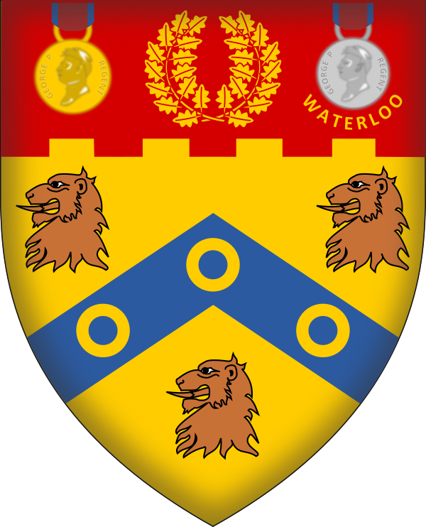 BlazonShield: Or, on a chevron azure between three lions' heads erased Proper, as many annulets Gold ; on a chief embattled Gules a wreath of oak Or between two martlets Argent. Crests: 1st, a lion's head erased proper charged with two bezants palewise and gorged with a collar Gules, thereon three annulets, Or with a chain of the last ; 2nd Issuant from a bridge of one arch embattled and having at each end a tower Proper, a demi-hussar in the uniform of the 18th regiment, holding in his right hand a sabre and in his left a red pennon flying to the sinister. Supporters: Dexter: A dragon wings elevated Gules gorged with a collar Or charged with three torteaux; Sinister: A horse Argent, saddle and bridle Proper, trappings Gules, gorged with a collar Sable charged with three bezants. Motto: Vive Anima Dei (Live by the Spirit of God) |