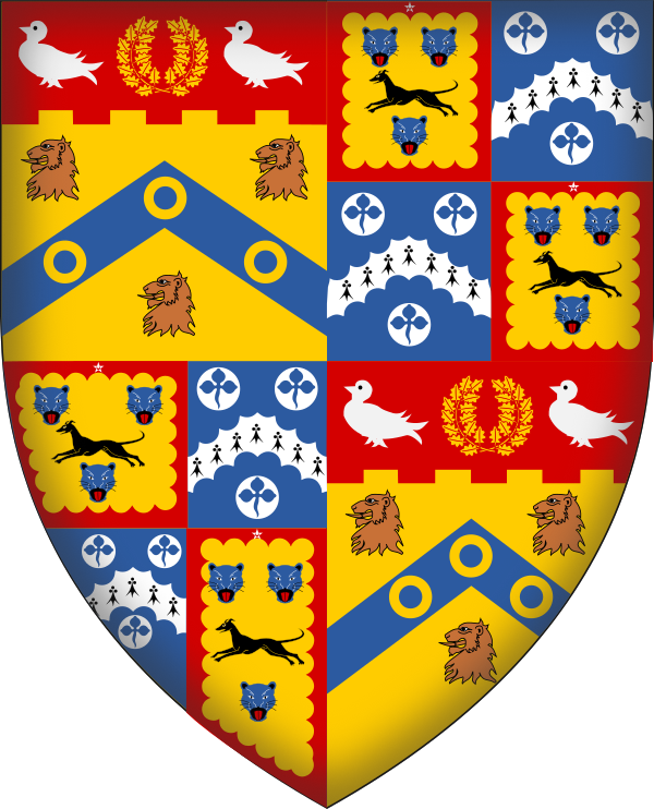 The middle arms are of a female-line descendant who changed his name to Vivian upon inheriting the Pencalenick estate in Cornwall in the 19th century.