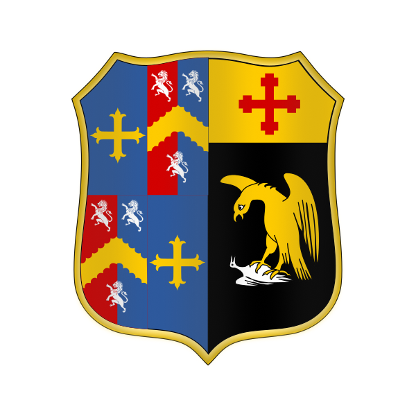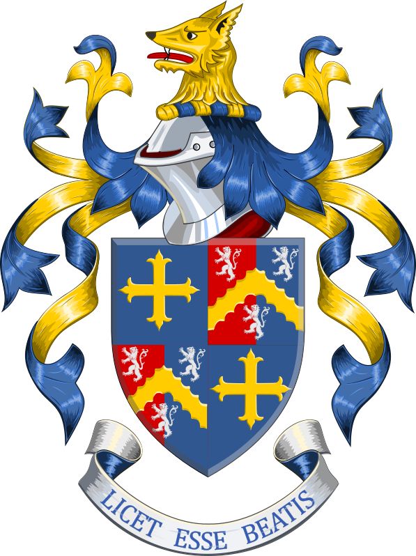 BlazonShield: Quarterly 1 & 4, Azure a cross Patonce Or (Warde); 2 & 3, Per pale Gules and Azure, a chevron engrailed Or between three lions rampant Argent (Hoskins). Crest: A wolf's head erased Or. Motto: Licet esse beatis (It is permitted to be joyful). |