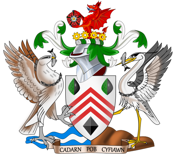 The three red chevronels are the traditional arms of the old princes of Gwyr. About these are arranged three devices two of which comprise a green pine cone dimidiating a goutte sable. This charge refers specifically to the reafforestation projects of the County, symbolised by the pine cone; the goutte is a liquid drop and is coloured black to symbolise oil with reference to the oil refining and attendant industries. The black diamond, represents the coal industry. The crest consists of a demi-Welsh dragon holding between its fore paws a Tudor rose. This whole device rises behind four annulets embattled on the outer edge all coloured gold. These refer to the four Districts which made up the County and the annulets refer to the industries of each. The dexter (left hand to the viewer) supporter is an osprey holding a fish in its beak, being fauna known to the area. Around its neck is a chain of steel links in reference to the importance of the steel industry to the area. The other supporter consists of a heron with an aluminium collar about its neck representing the aluminium industry, the heron holds in its beak a fish. The fish of the two supporters refer to the maritimeinterests of the area. The compartment - base under the supporters - consists of water to the dexter being a further reference to the maritime interests and the water harbour for which the area is famous; the other part of the compartment consists of a ploughed field and is a reference to the importance of agriculture in the area.
