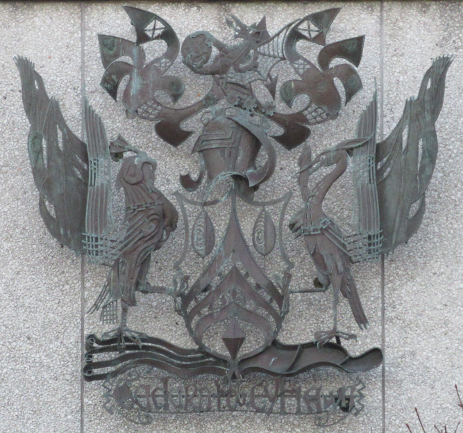 The arms rendered in metal on Swansea Civic Centre (formerly West Glamorgan County Hall) |